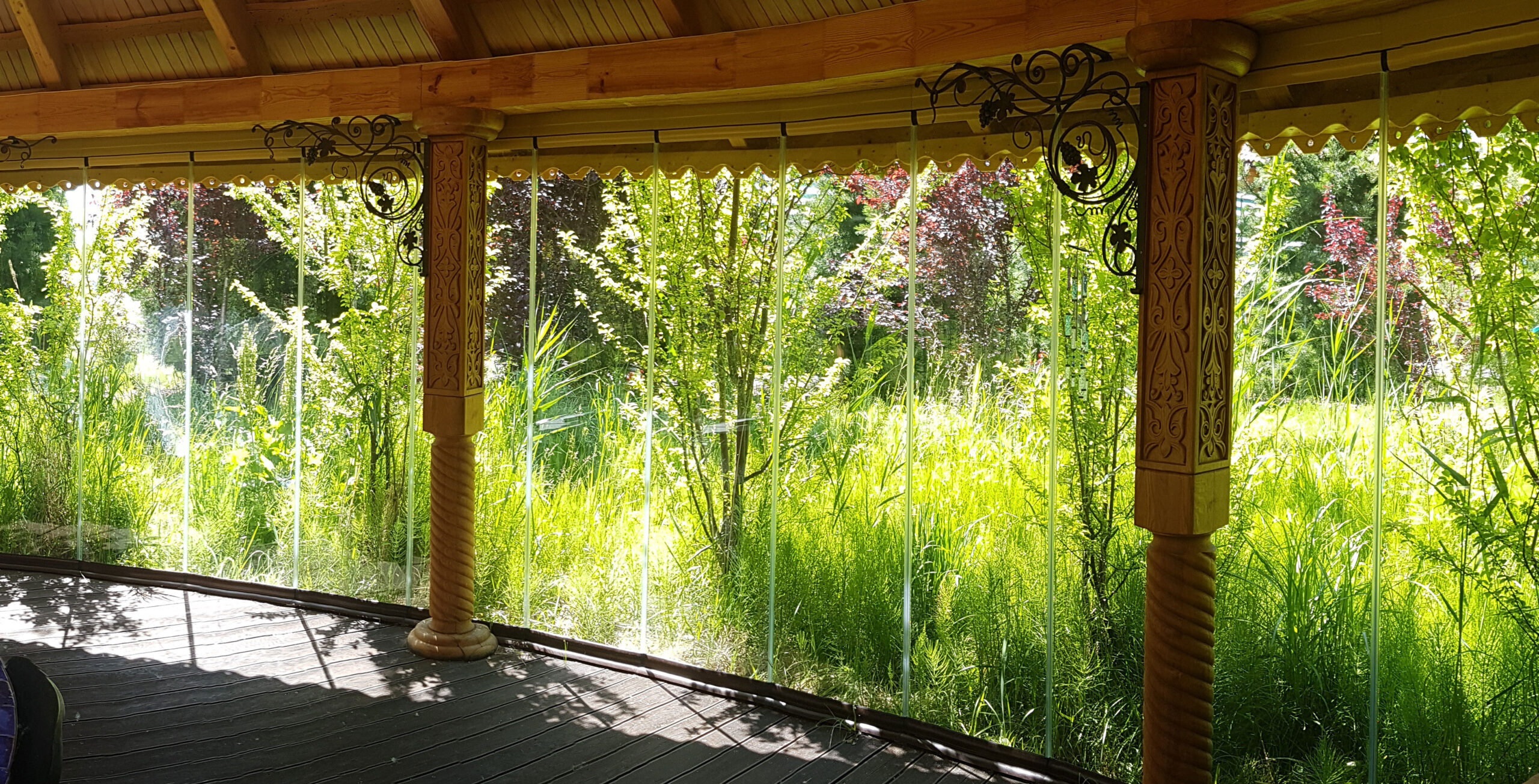 Це рішення дозволить вам захистити веранду від вітру та дощу, і одночасно з цим зберегти повне занурення у природу. Що може бути краще, ніж відпочити в оточенні зелені, квітів та природних ароматів за чашкою чаю?