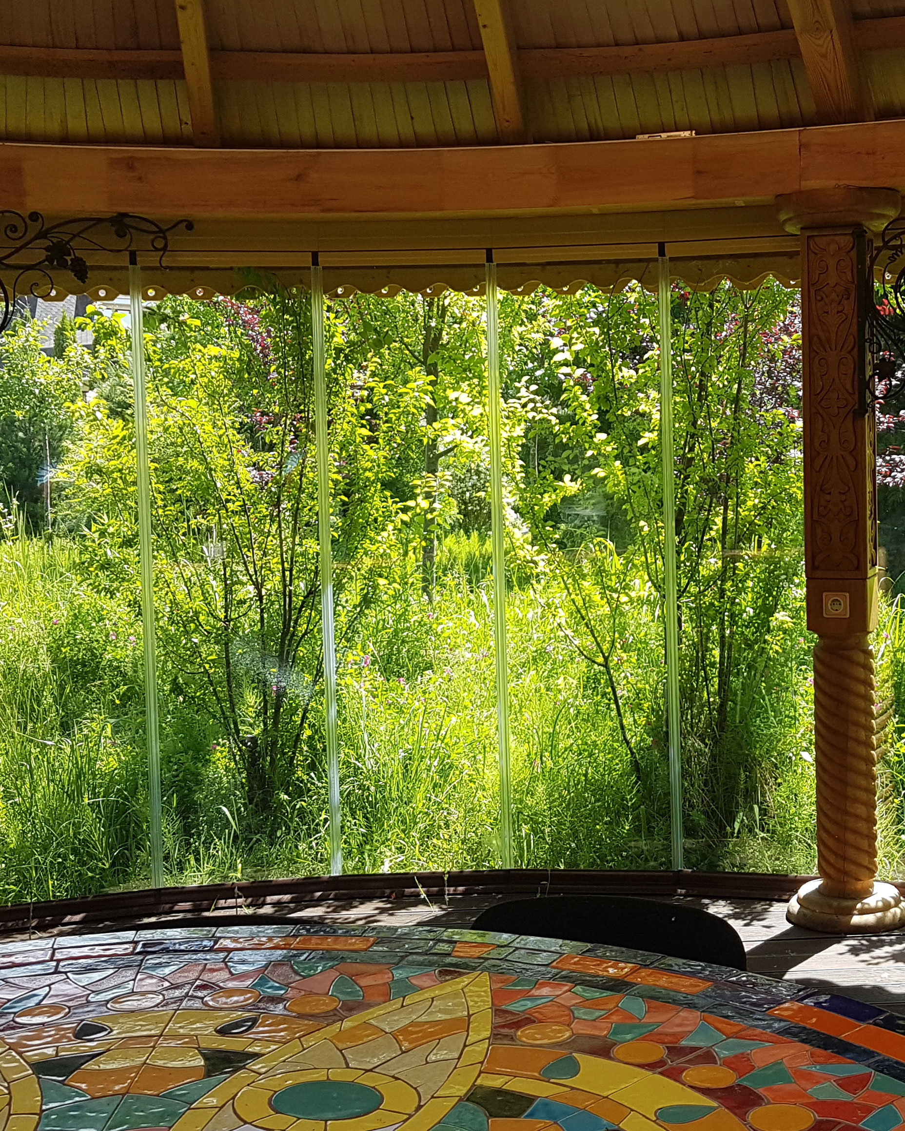 Це рішення дозволить вам захистити веранду від вітру та дощу, і одночасно з цим зберегти повне занурення у природу. Що може бути краще, ніж відпочити в оточенні зелені, квітів та природних ароматів за чашкою чаю?